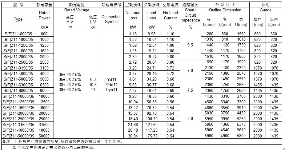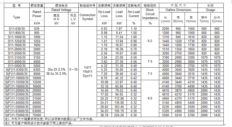 华屹集团35kV 630~75000kVA三相双绕组无励磁调压电力变压器性能参数表