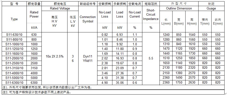 华屹集团10kV 630~6300kVA三相双绕组无励磁调压电力变压器性能参数表